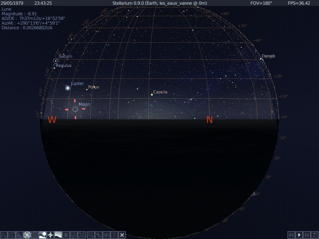 Le 29 mai 1979 vers 23h 30 un automobiliste circulant sur une petite route de campagne est surpris de voir un objet en forme de croissant de lune orange vif venant dans sa direction. Cet objet à faible altitude semble suivre l'automobiliste tout au long de son déplacement vers le Nord-Ouest. Aucun bruit n'est entendu. L'objet sera perdu de vue. Le lendemain, le témoin retournera au même endroit et constatera la présence du même objet mais de couleur blanche. Celui-ci disparaitra derrière les bois en direction du Nord-Ouest. La carte du ciel ce soir là nous indique la présence à basse altitude et au Nord -Ouest de la Lune avec une magnitude de -8,91 : cette personne a fait une observation astronomique de la Lune. L'impression de mouvement de celle-ci quand on se déplace est bien connu.