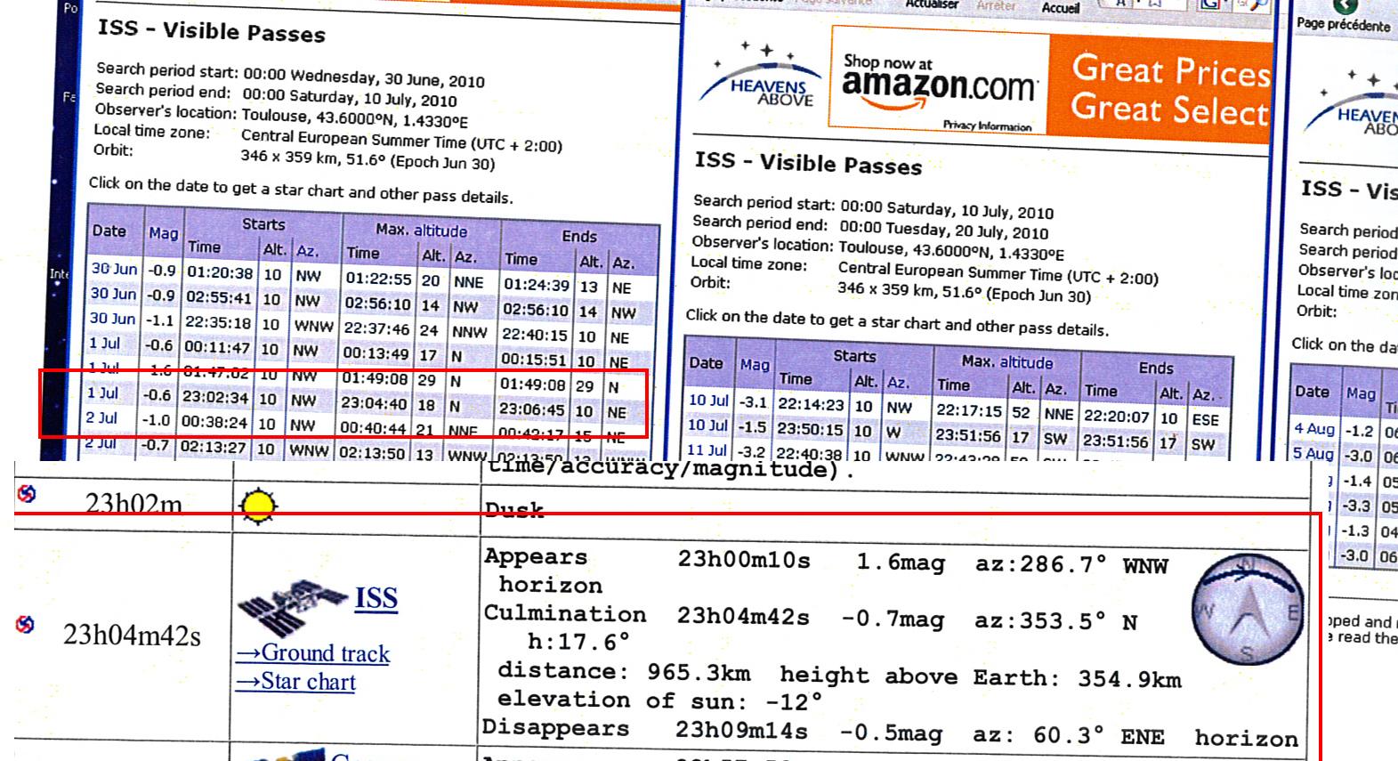 Les prévisions de passage de la Station Spatiale Internationale avaient été calculées pour faire une actualité du ciel d'été 2010 sur le site internet du Geipan ( http://www.cnes-geipan.fr/geipan/actualites/01072010-Ciel-dete-Attention-aux-meprises-.html ). Ces prévisions montrent que le témoin a probablement observé le passage de L'ISS.