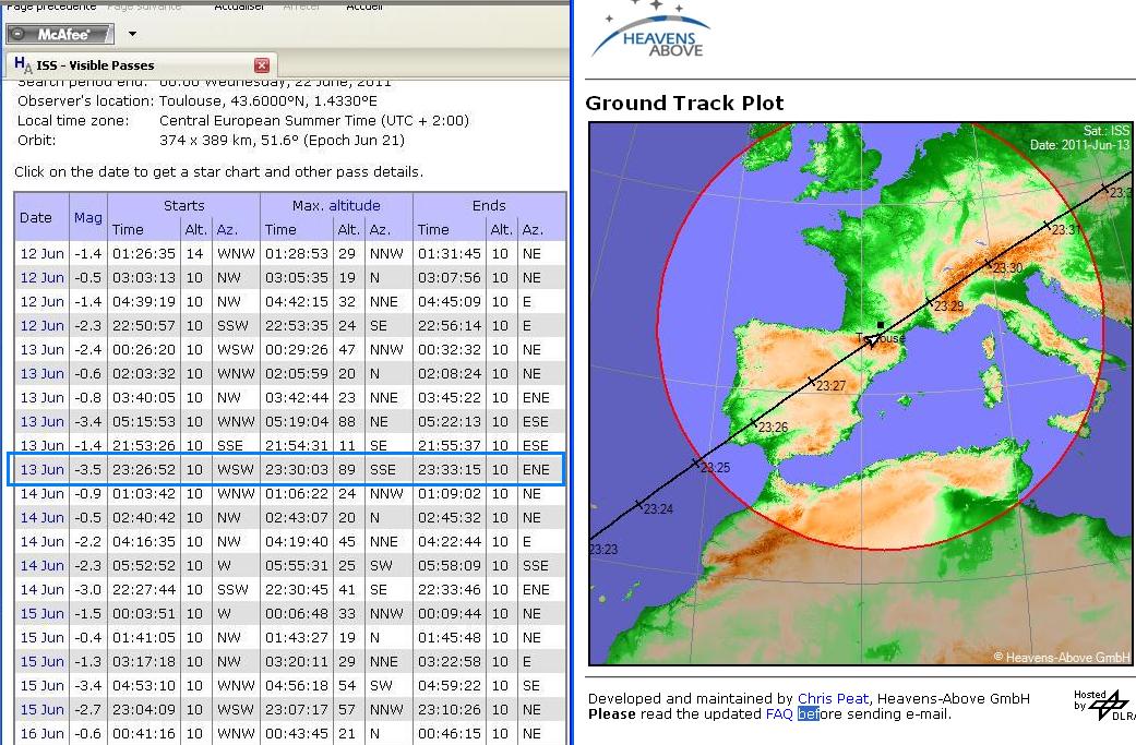 Le fichier de passage de la Station Spatiale Internationale ainsi que sa trace au sol sont compatibles avec l'observation du témoin. Le véhicule ATV2 était à cette date là 'docké' à la station et la magnitude pour ce passage était de -3,5, c'est à dire très lumineuse et visible à l'œil nu.