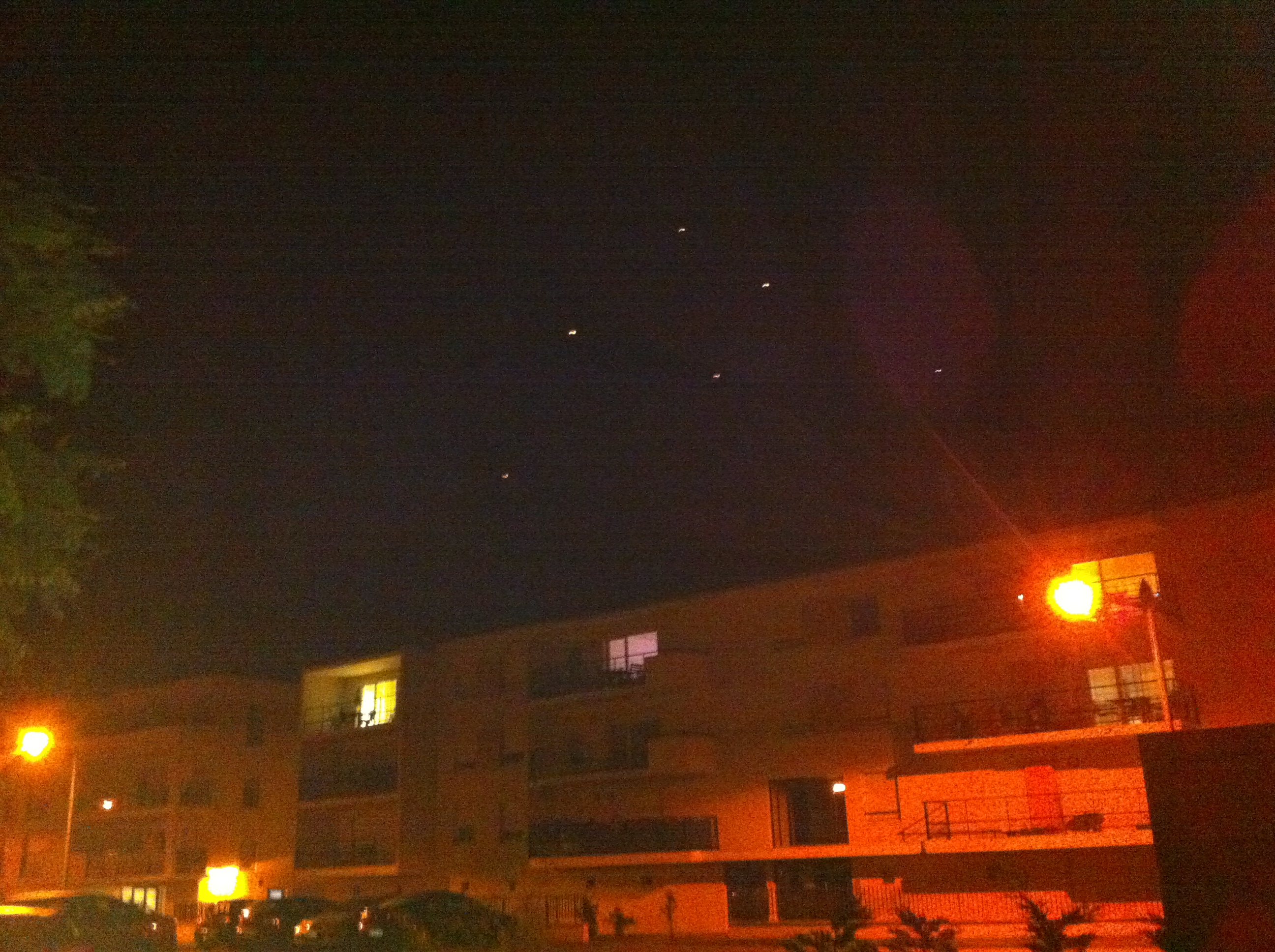 Le 01 octobre 2011 vers 22h30 des témoins observent le déplacement silencieux dans le ciel de plusieurs boules lumineuses jaune-orangée. Un des témoin prend une vidéo depuis son téléphone portable.