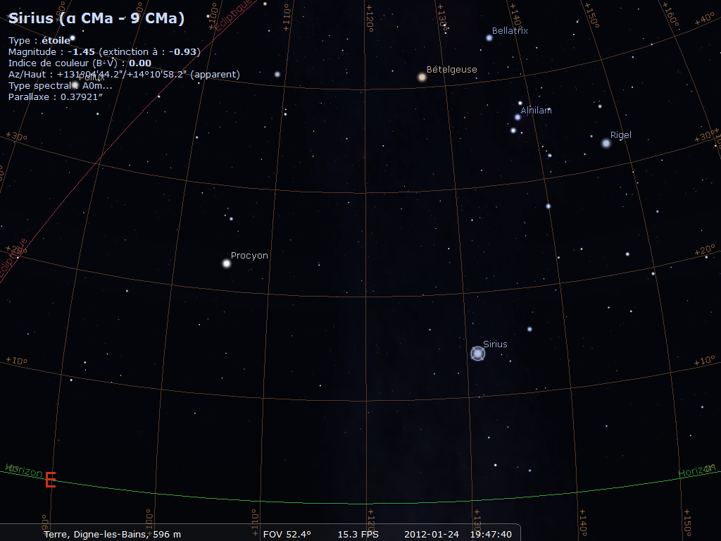 Dans la deuxième partie de l'observation (voir la carte, flèche de gauche), le témoin observe vers le Sud Est : c'est un autre astre brillant qui est bien visible : l'étoile Sirius, la plus brillante du ciel (Mag -1,45) mais moins brillante que Vénus, elle apparaît logiquement plus lointaine au témoin.
