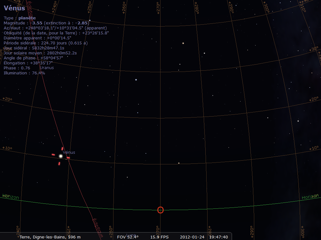 Dans la direction indiquée par le témoin au début de l'observation (vers 250°, au SO) (Voir sur la carte, les 2 flèches à droite) se trouve effectivement la planète Vénus très brillante (magnitude -3,5) à basse élévation (10°) (voir carte Stellarium).