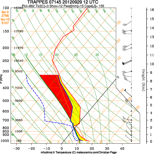 Par contre Météo-France fait des lâchers de ballons sondes quotidiens depuis Trappes vers 12h TU, soit à 14h locales, c'est-à-dire une heure avant l'observation (voir le relevé qui indique que le vent au sol est du NW assez faible (5 kt) à 14h,qu'il passe ensuite à W plus fort (25 kt) à partir de 2800 M, pour repasser au NW plus haut). Comme les vents en altitude soufflaient vers l'Est, ce ballon expliquerait bien l'observation, environ une heure après le lâcher. Les clignotements correspondent à la rotation du ballon ou de réflecteurs.