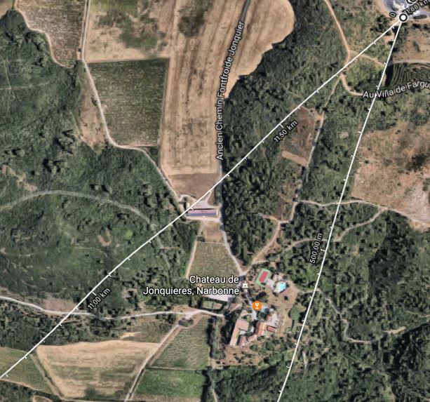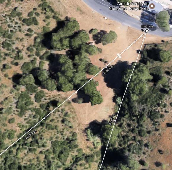 Pour confirmer cette hypothèse par triangulation, nous utilisons la déclaration du témoin concernant la première observation (en 1-a), le véhicule se déplaçant sur l'autoroute, de 500 à 800 mètres avant l'arrêt sur l'aire de repos. En reportant cette distance sur l'autoroute en amont de l'aire de repos, nous constatons qu'avant ce point, l'autoroute se trouve en montée, élargie à 3 voies, dans une saignée dans les collines avec des devers de part et d'autre masquant l'horizon. En remontant à 800 mètres, l'autoroute est sur le plateau, l'horizon dégagée vers l'avant du témoin, en visibilité du Château de Jonquières, situé à 1,35 kilomètre. Ce phénomène à 45° à droite du véhicule ne peut pas passer inaperçu !
