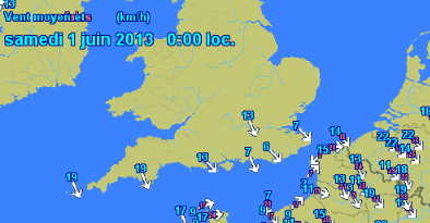 Le relevé Météociel du vent local indique un léger vent d'Ouest à Nord Ouest qui n'est pas cohérent avec le déplacement constaté, (plutôt vers l'Est). Mais on constate un vent de Nord Est à Boulogne ; les vents côtiers sont souvent complexes, et de direction différente selon les altitudes.