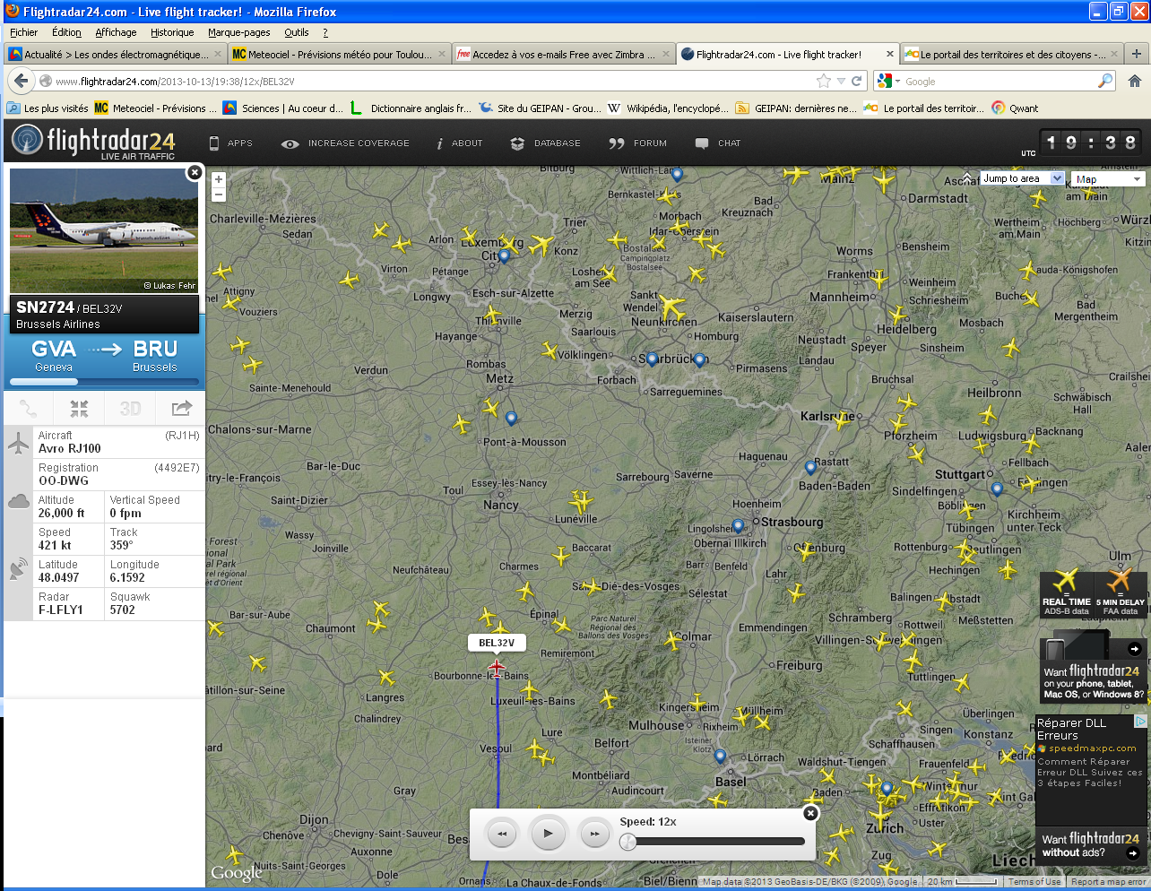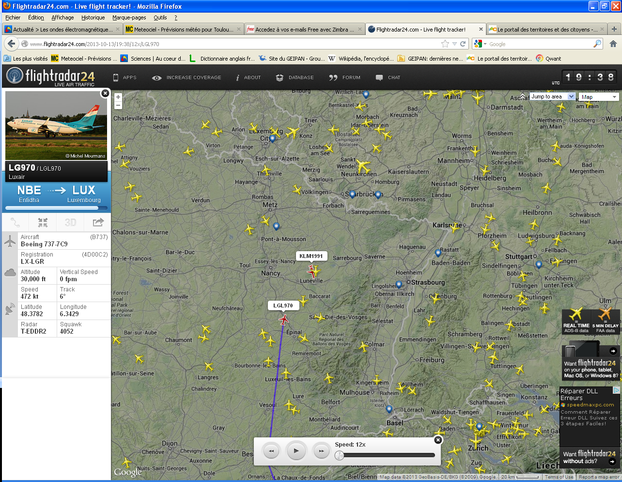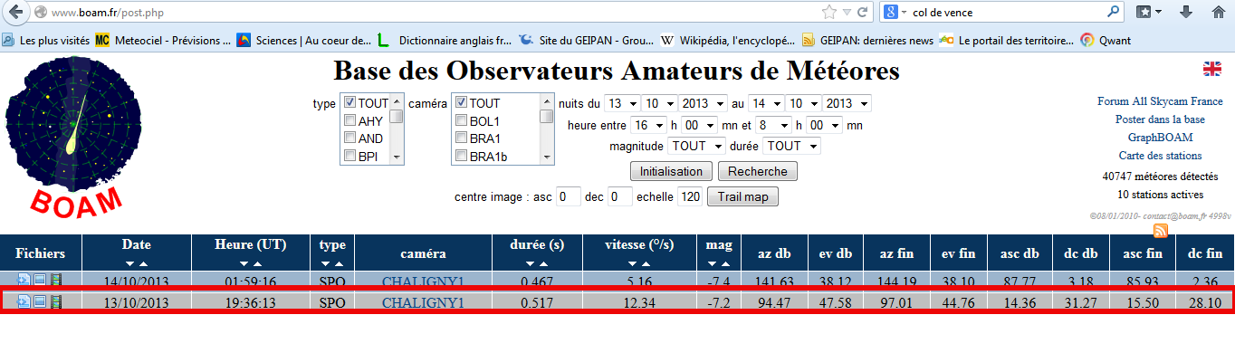 Le 13 octobre 2013 quatre pilotes (voir les positions estimées des 4 avions sur le questionnaire aéronautique) ont observé un puissant phénomène lumineux dans l'Est de la France, phénomène observé aussi au sol (voir article de presse), et par la caméra de Chaligny (près Nancy) du réseau BOAM.