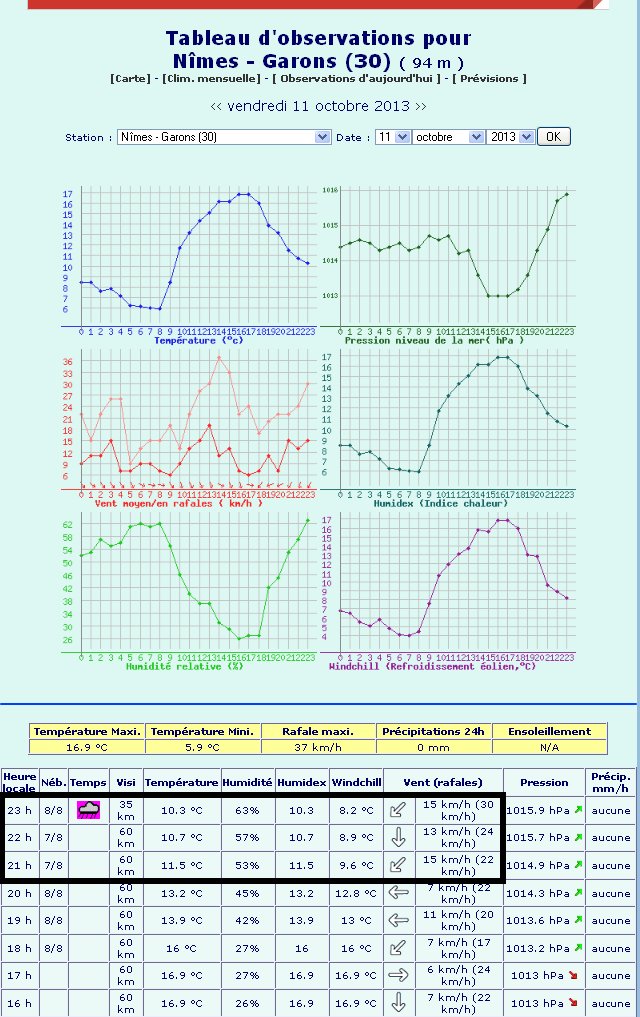 -étoile ou planète : le témoin indique un ciel très nuageux, les relevés météo de Nimes et d'Avignon aussi. De plus, dans la direction proche de celle indiquée par le témoin (Sud-Est), il n'y a pas d'astre très brillant, susceptible d'être visible à travers une mince couche nuageuse.