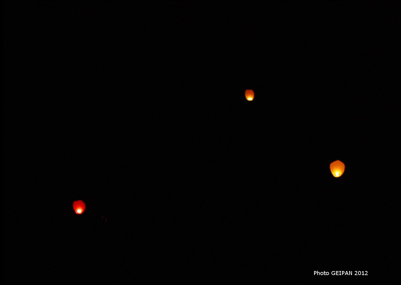 On relève un vent très faible, variable de Sud à Est : météo. Le comportement des objets est compatible avec des objets portés par le vent. La couleur orange évoque la couleur des flammes des lanternes thaïlandaises. Mais la forme triangulaire décrite par le témoin ne semble pas compatible de cette hypothèse. (Voir la photo GEIPAN DSC7031 de trois lanternes thaïlandaises qui pourraient ressembler à ce qu'a vu le témoin).