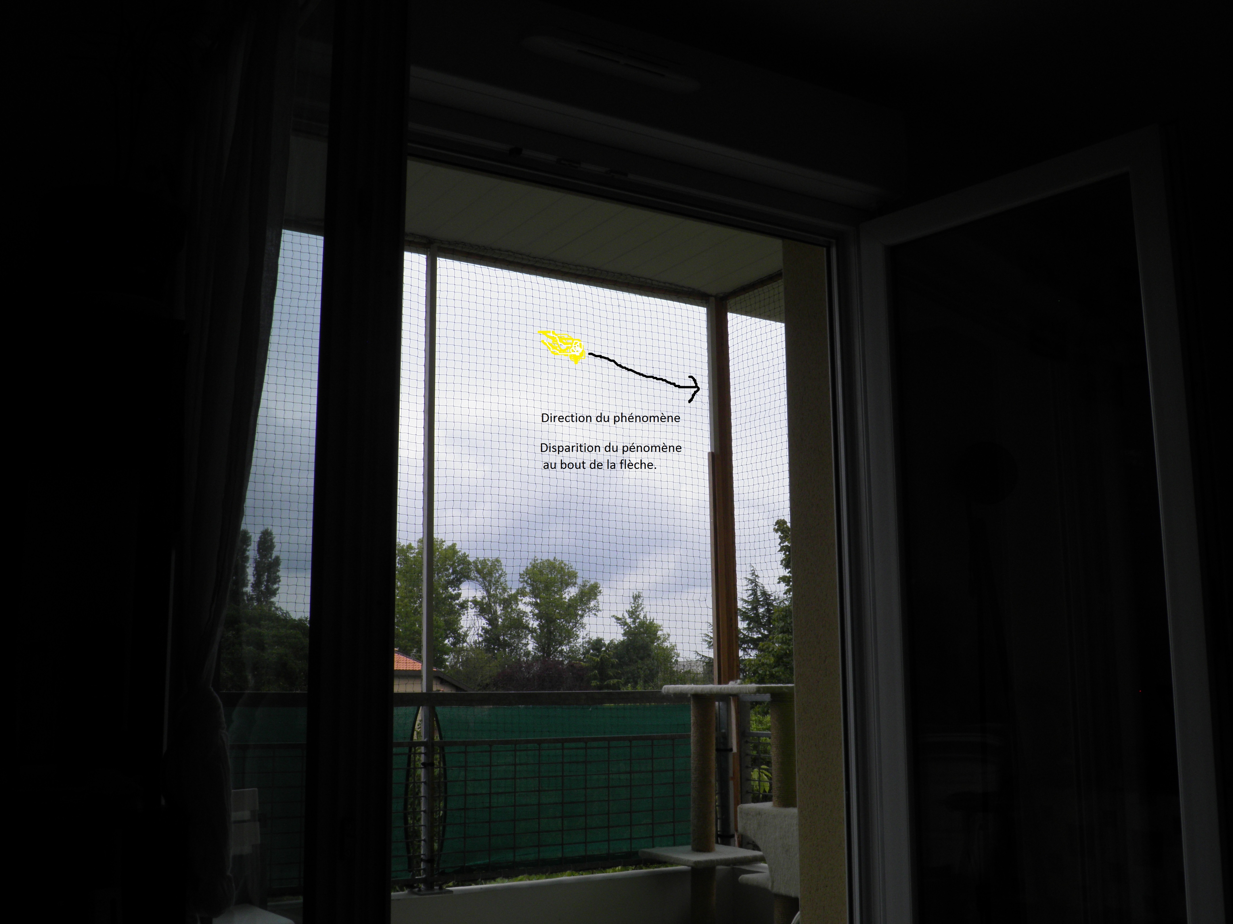 Le 17 août 2014 vers 21h10 un témoin observe, par la fenêtre ouverte, le passage rapide d'une grosse boule de feu avec une trainée courte de couleur jaune-blanc, très vive et très lumineuse. Après un déplacement horizontal, le phénomène disparaît. L'observation ne dure que quelques secondes.