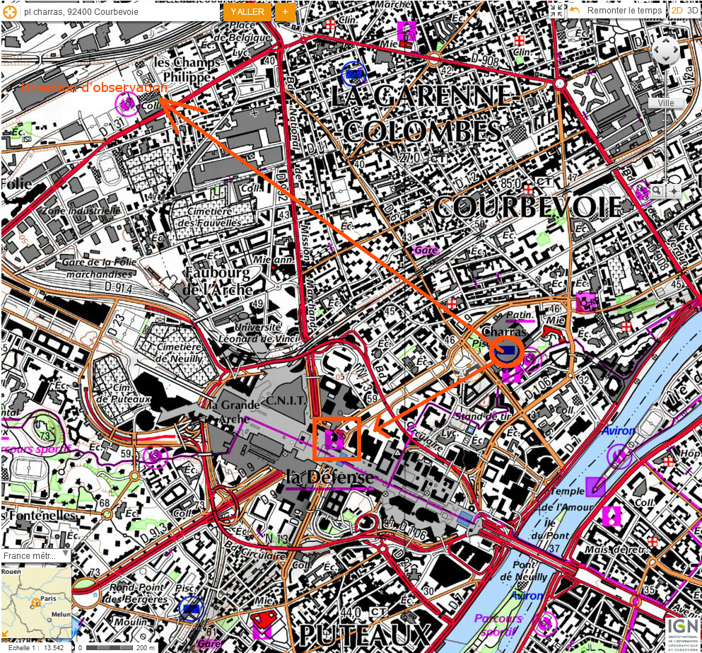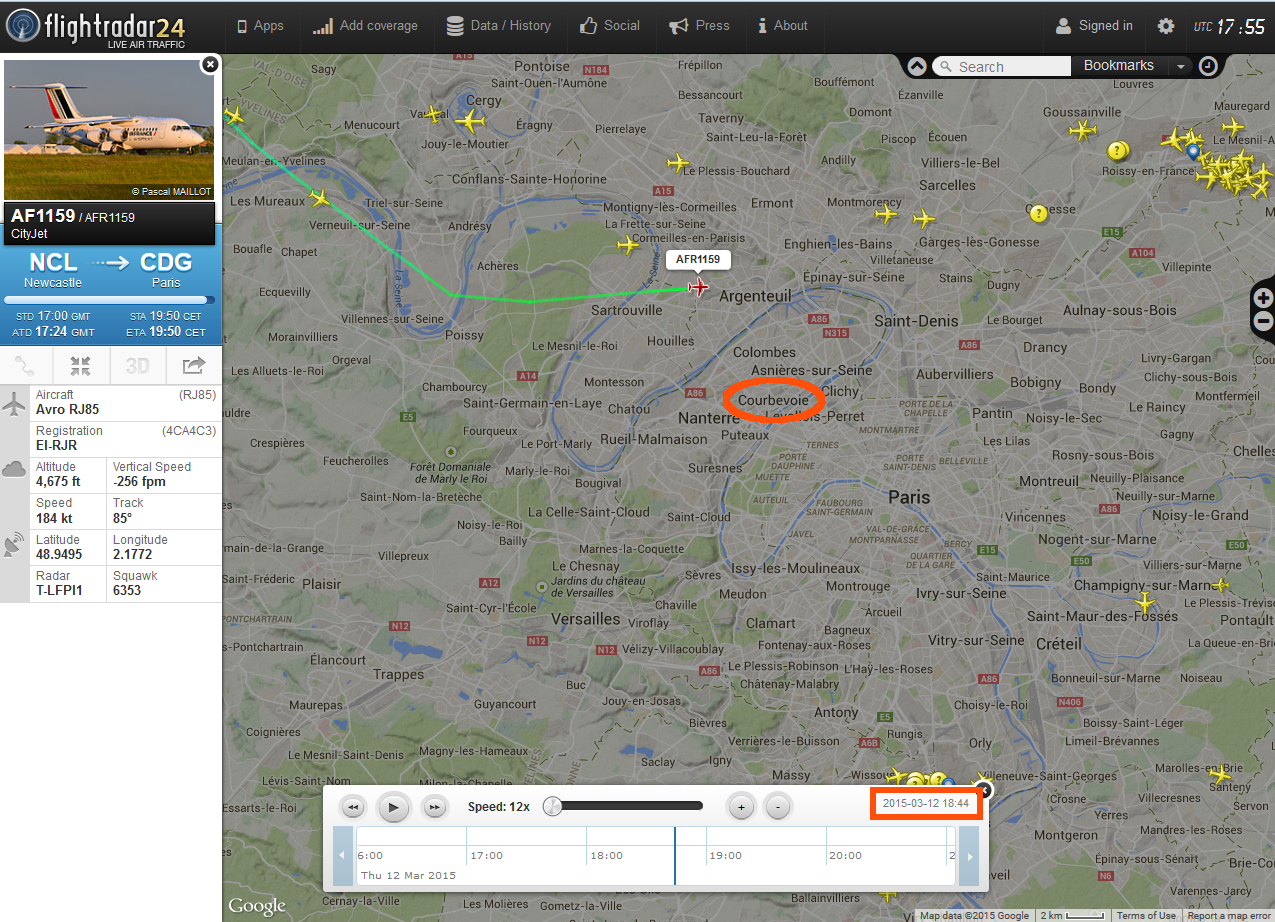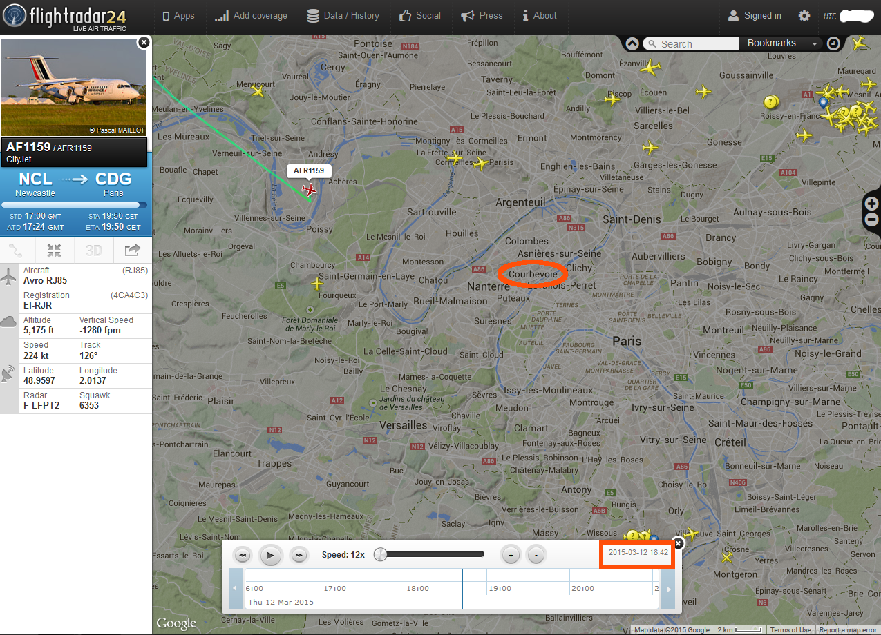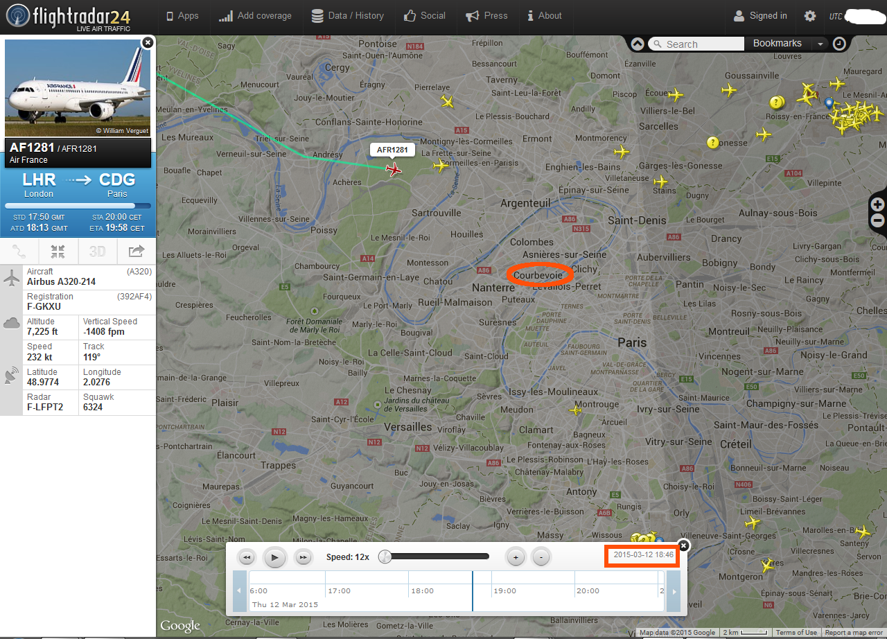 Le témoin observe depuis Courbevoie, à 85° à droite de la tour Total de la Défense (voir carte), ce qui donne une direction de Nord-Ouest. Une vérification du trafic aérien civil (voir relevé Flightradar) montre qu'à ce moment précis, les vols AFR1159 et AF1281 en descente vers Roissy, étaient dans l'axe de vue des témoins, puis ces vols ont ensuite légèrement viré vers le Nord. La vidéo prise par le témoin est totalement conforme à cette explication. On rappelle qu'un avion vu se préparant à atterrir, donc vu de face, peut être vu à plus de 20 km grâce à ses feux d'atterrissage, lesquels rendent quasi invisibles à l'oeil les feux clignotants et feux de position (vert et rouge). Lorsque l'axe de l'avion n'est plus dans la direction de l'observateur, ces puissants feux, qui ont un faisceau relativement étroit, ne sont plus visibles par l'observateur. Voir l'article avion?.