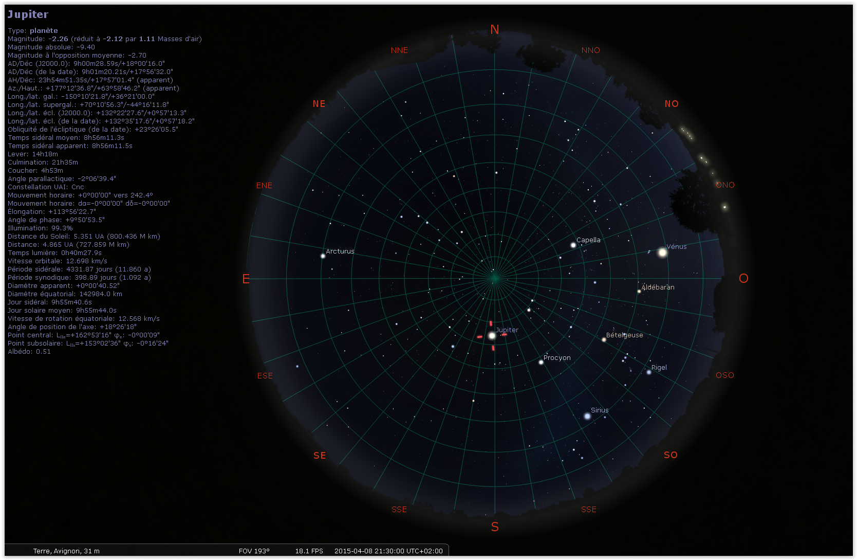 Le témoin indique que le PAN se trouvait au sud-sud-est (200°) et à 60° d’élévation. Jupiter se trouvait, vu depuis Avignon (84) à 21h30 à l’azimut 177° et à une élévation de 64° (voir le document sur la situation astronomique). L’écart est donc de 23° en azimut et de 4° en élévation.