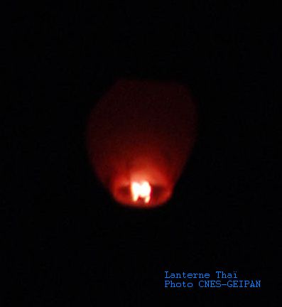 L'observation de séries de formes lumineuses rouges ou blanches traversant le ciel en quelques minutes, une nuit de week-end, fait nettement penser à des lanternes thaï, probablement lâchées à proximité à l'issue d'une fête privée.