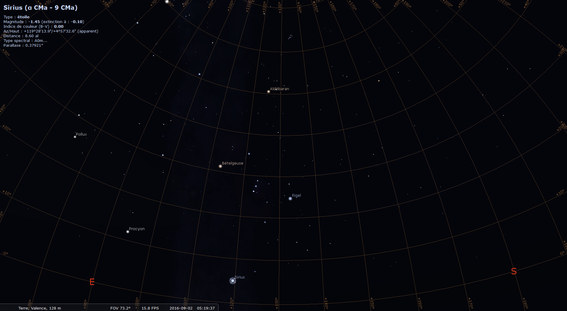 Observation très tot le matin d'une boule blanche très lumineuse et immobile très bas sur l'horizon : observation de l'étoile Sirius.