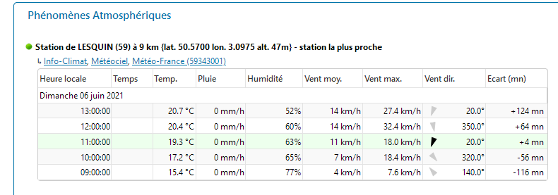 La station météorologique de Lesquin, située à 9 km du témoin fait état d’un vent au 20° pour une force de 11km/h avec des rafales de 18km/h, au moment de l’observation (voir document joint).