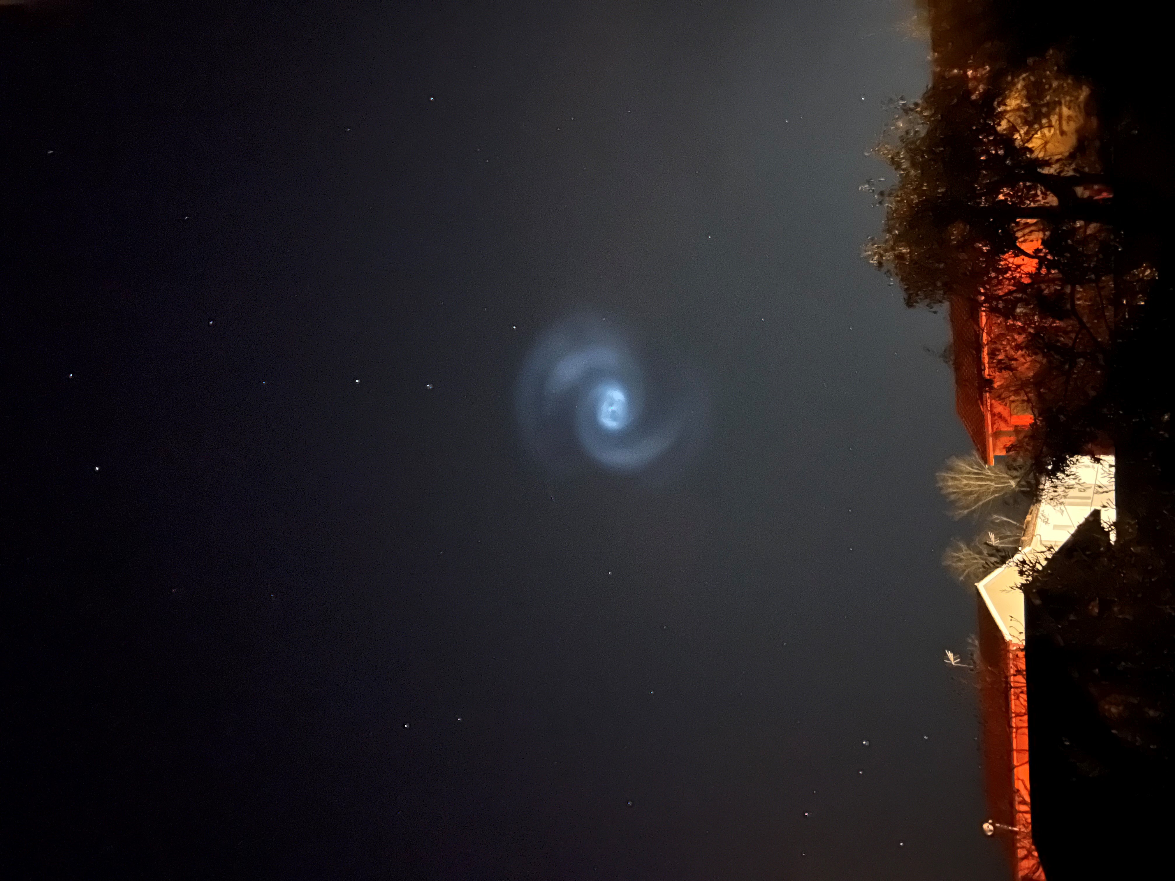 Le gaz d'ergol utilisé dans les fusées, tel que l'oxygène liquide et le kérosène, peut créer des effets visuels uniques lorsqu’il est relâché dans l'atmosphère terrestre. Ces gaz, qui sont sous haute pression dans les réservoirs, se dilatent rapidement une fois libérés, provoquant des formations en spirale dues à la rotation du gaz ou à l’interaction avec les courants aériens. De plus, l'éclat bleu observé résulte probablement de la réaction de l’oxygène dans les gaz avec la lumière solaire ou d'autres conditions atmosphériques particulières.